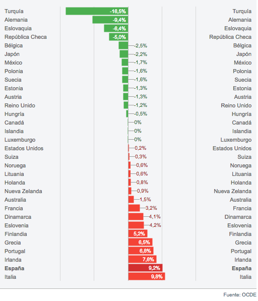 Finalmente, otro de los puntos sobre los que llama la atención la OCDE es el de la caída del gasto en Educacion en España. Mientras que en la mayoría de los países de la organización el gasto público total en todos los niveles de Educación se mantuvo estable entre 2008 y 2013, en torno al 11% del gasto púbico total, en España bajó del 9% de 2008 al 8% en 2013.